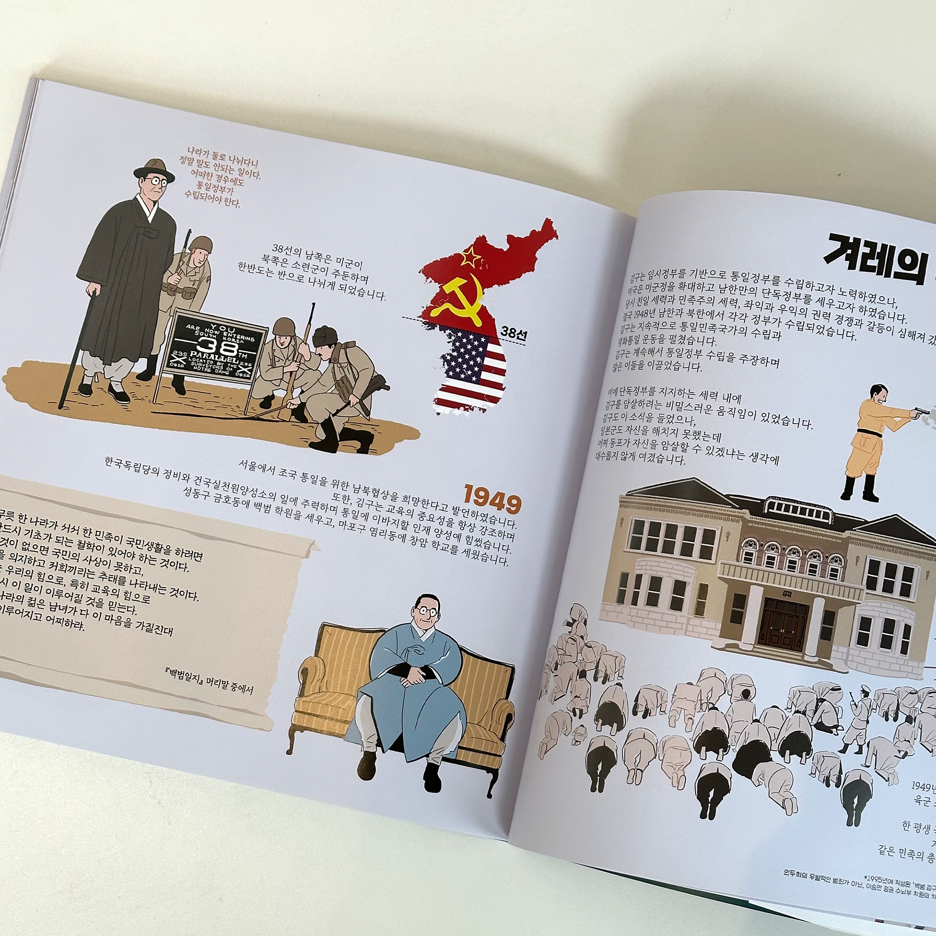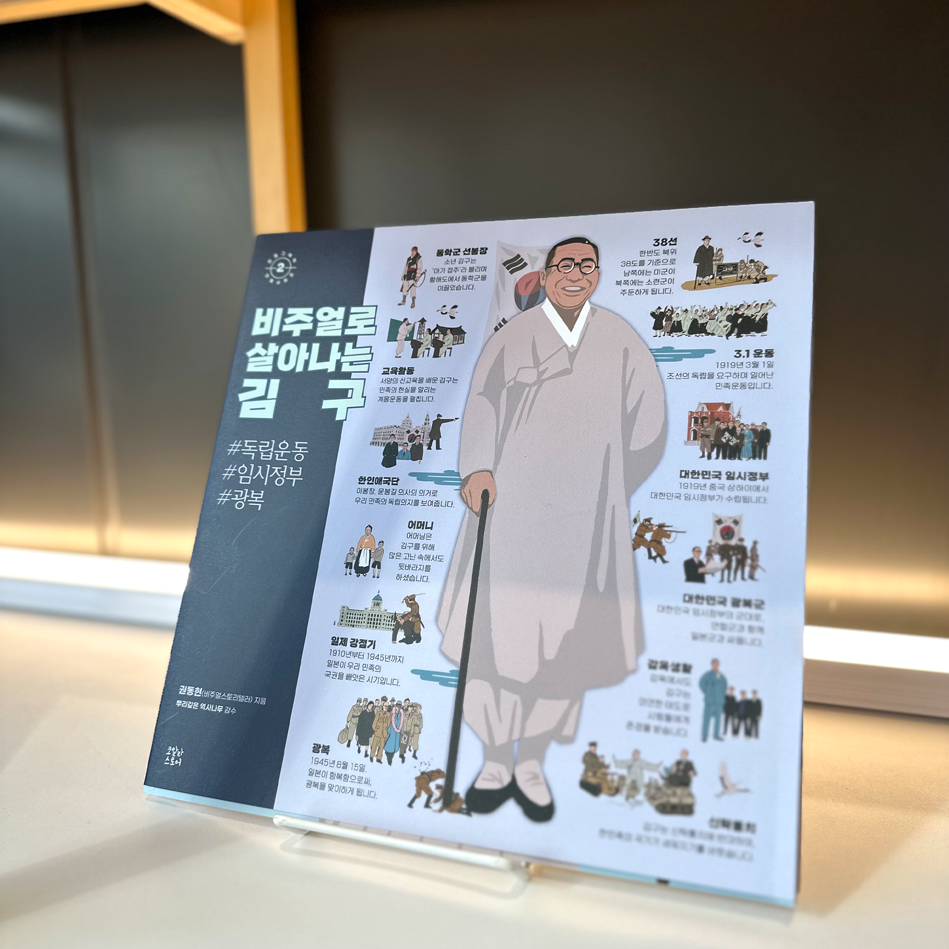 이 책의 저자인 권동현 작가는 ‘비주얼스토리텔러’라는 이름으로 활동하고 있는데요. 글과 그림이 넘쳐나는 요즘 시대에 필요한 정보만을 골라 한눈에 볼 수 있게 만드는 작업을 하는 작가입니다. 복잡한 내용을 한 장의 그림으로 요약해내는 비주얼스토리텔러 권동현 작가, 그가 표현해낸 민족을 위해 한평생 투쟁한 김구 선생님과 독립운동, 대한민국 임시정부 이야기.