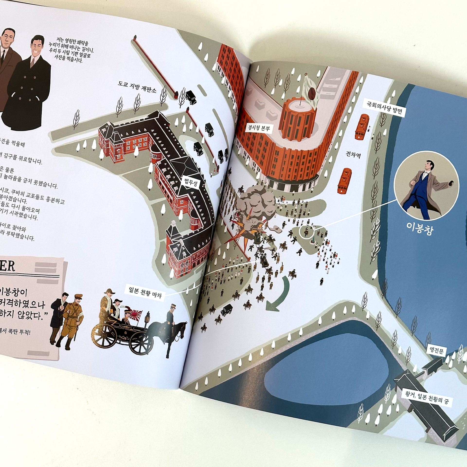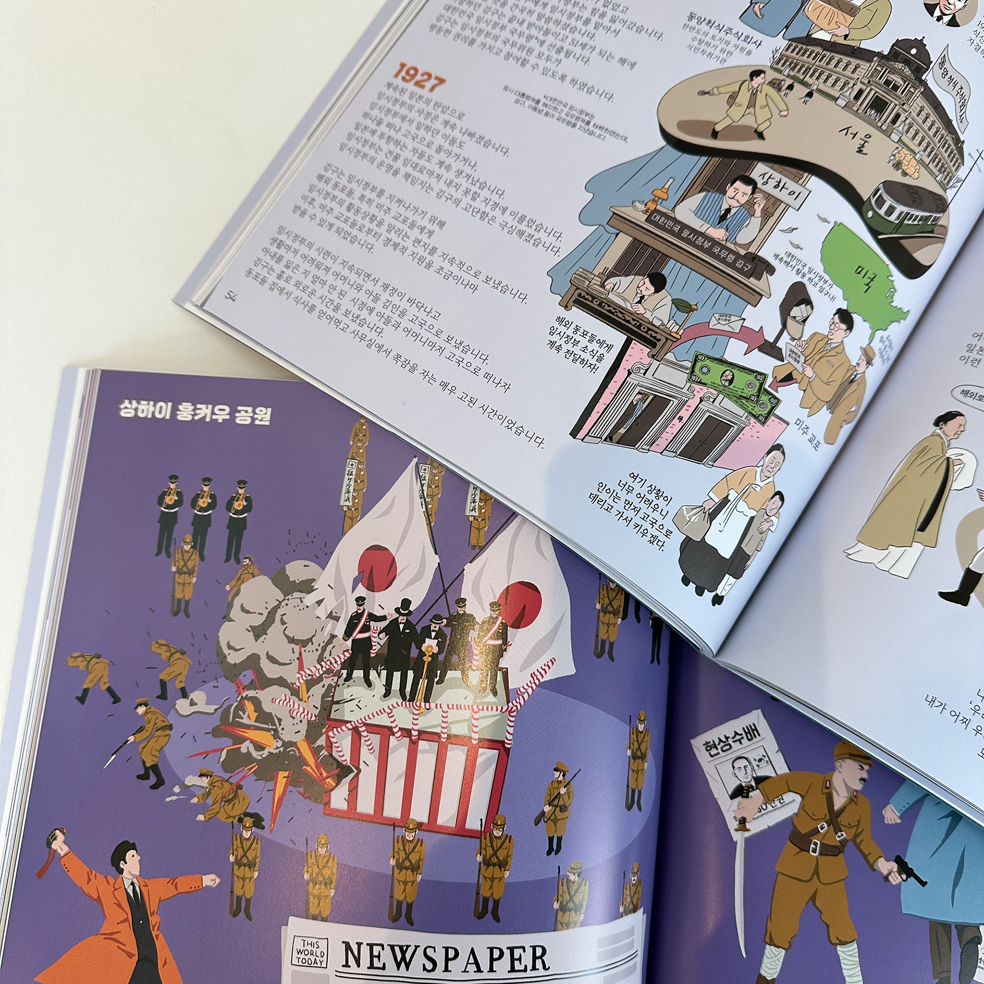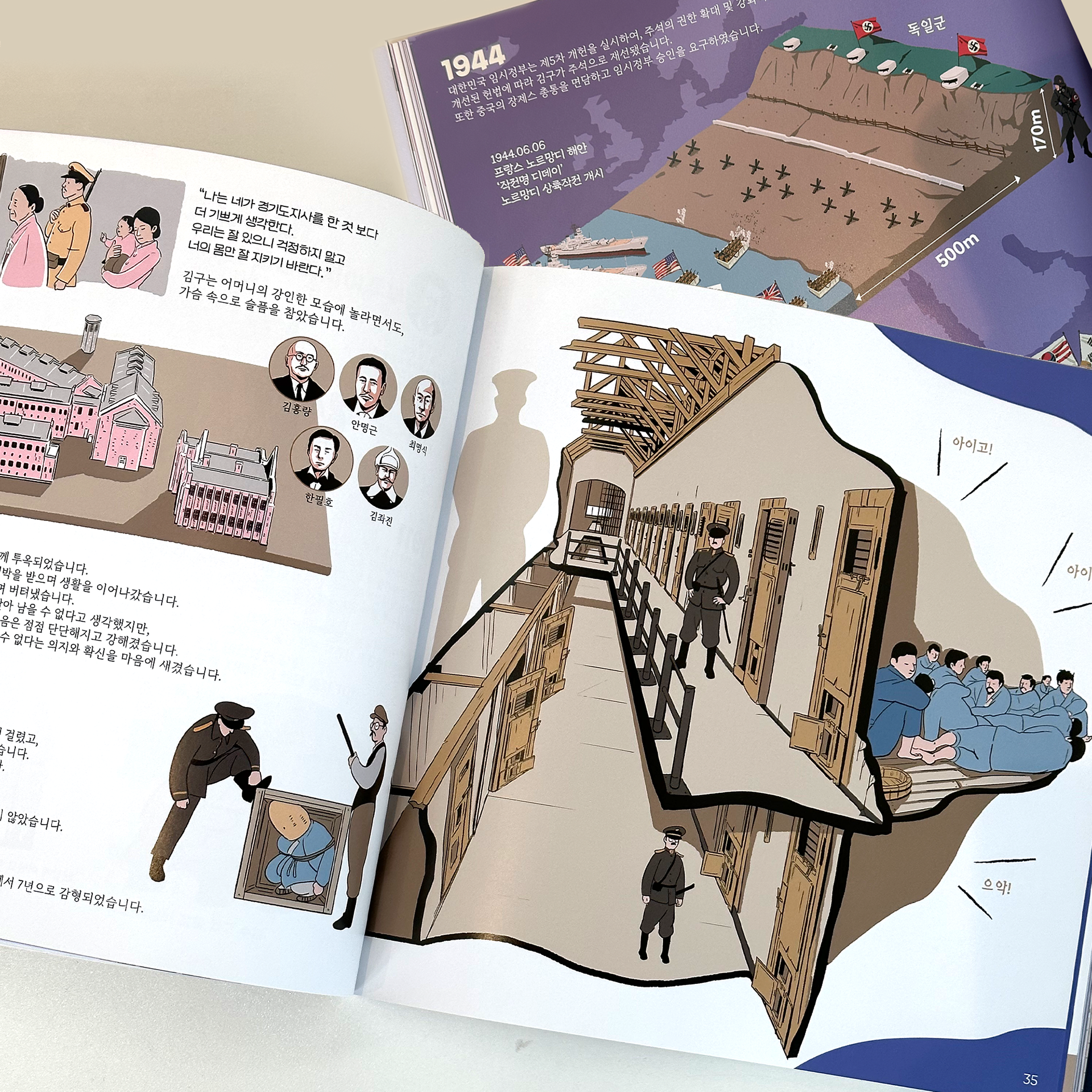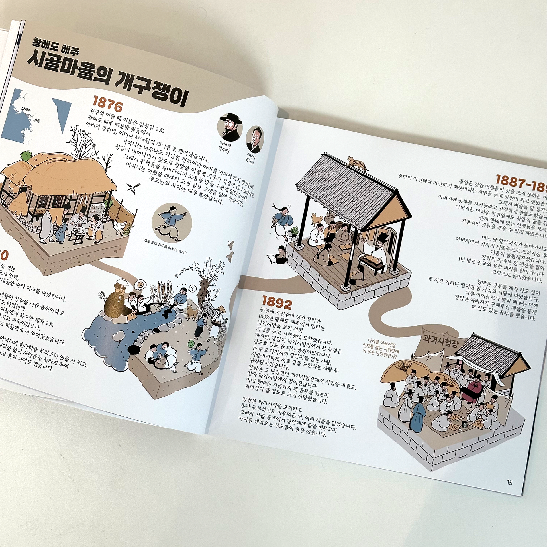 평생 국가와 민족을 위해 투쟁하셨던 김구 선생님은 어떤 모습이었을까요? 큰 그림으로 김구 선생님의 모든 것을 담아낸 『비주얼로 살아나는 김구』는 한 장 한 장 넘길 때마다 치열했던 그의 생애가 생생히 보이는 듯합니다. 개구쟁이였던 어린 시절 창암(김구 선생님의 어린 시절 이름)을 따라 동학농민운동에 참여했던 열혈 창수(김구 선생님의 두 번째 이름)를 지나, ‘김구’라는 이름과 ‘백범’이라는 호로 본격적으로 독립운동에 뛰어들었던 대한민국 임시정부 시절 이야기를 만나 보세요. 또한 여전히 우리가 나아가야 할 길을 알려주는 광복 이후의 모습도 확인할 수 있습니다. 책에서는 김구 선생님의 일생과 그의 생각 그리고 우리 민족이 겪었던 격동의 시기를 그림을 통해 입체적으로 전달합니다. 최후의 임시정부 청사였던, ‘충칭 대한민국 임시정부 청사’의 건물 조경도와 김구 선생님의 행적을 표시한 지도, 그리고 당시 한반도의 정세를 재치 있게 표현한 그림까지! 어렵게 느껴지던 시기를 비주얼 스토리텔링 기법으로 한 권에 담았습니다.