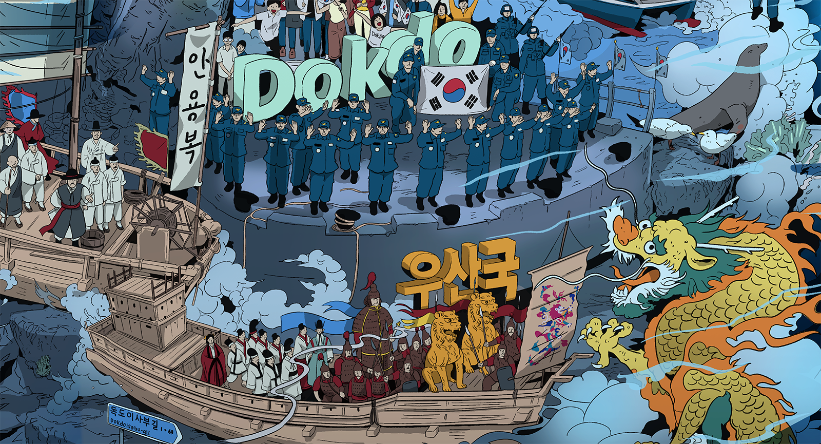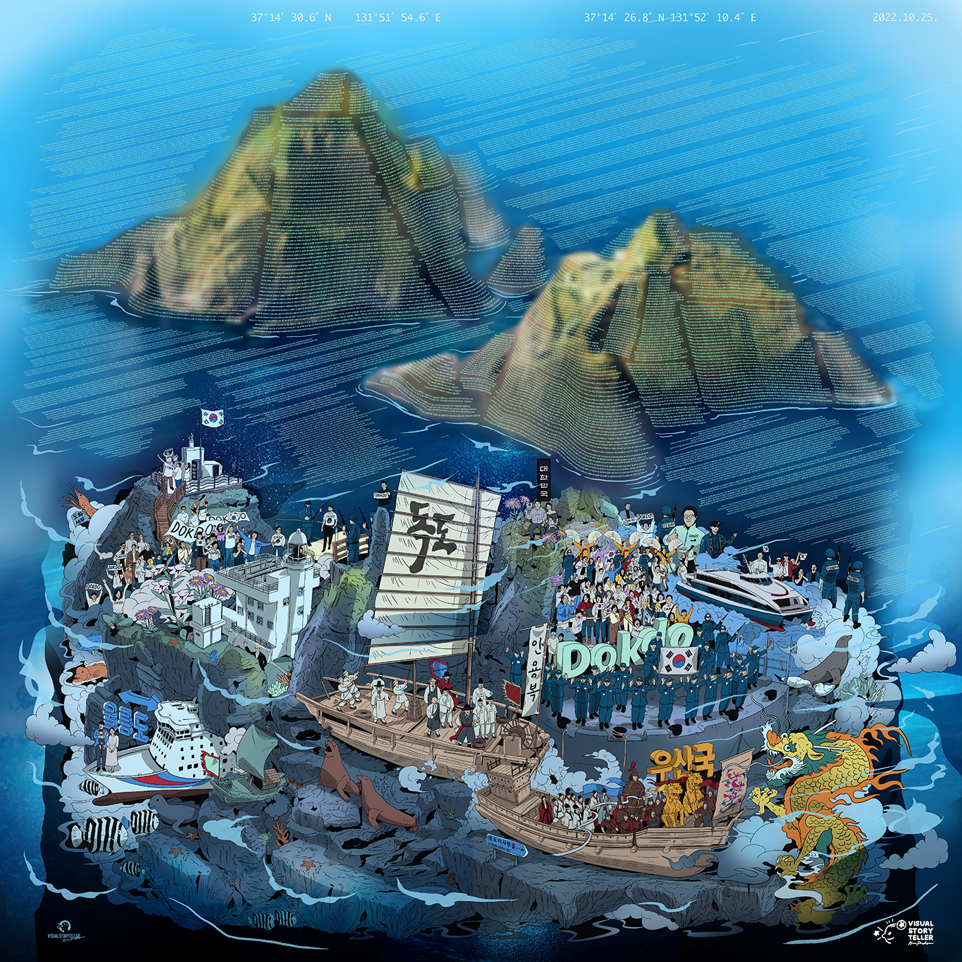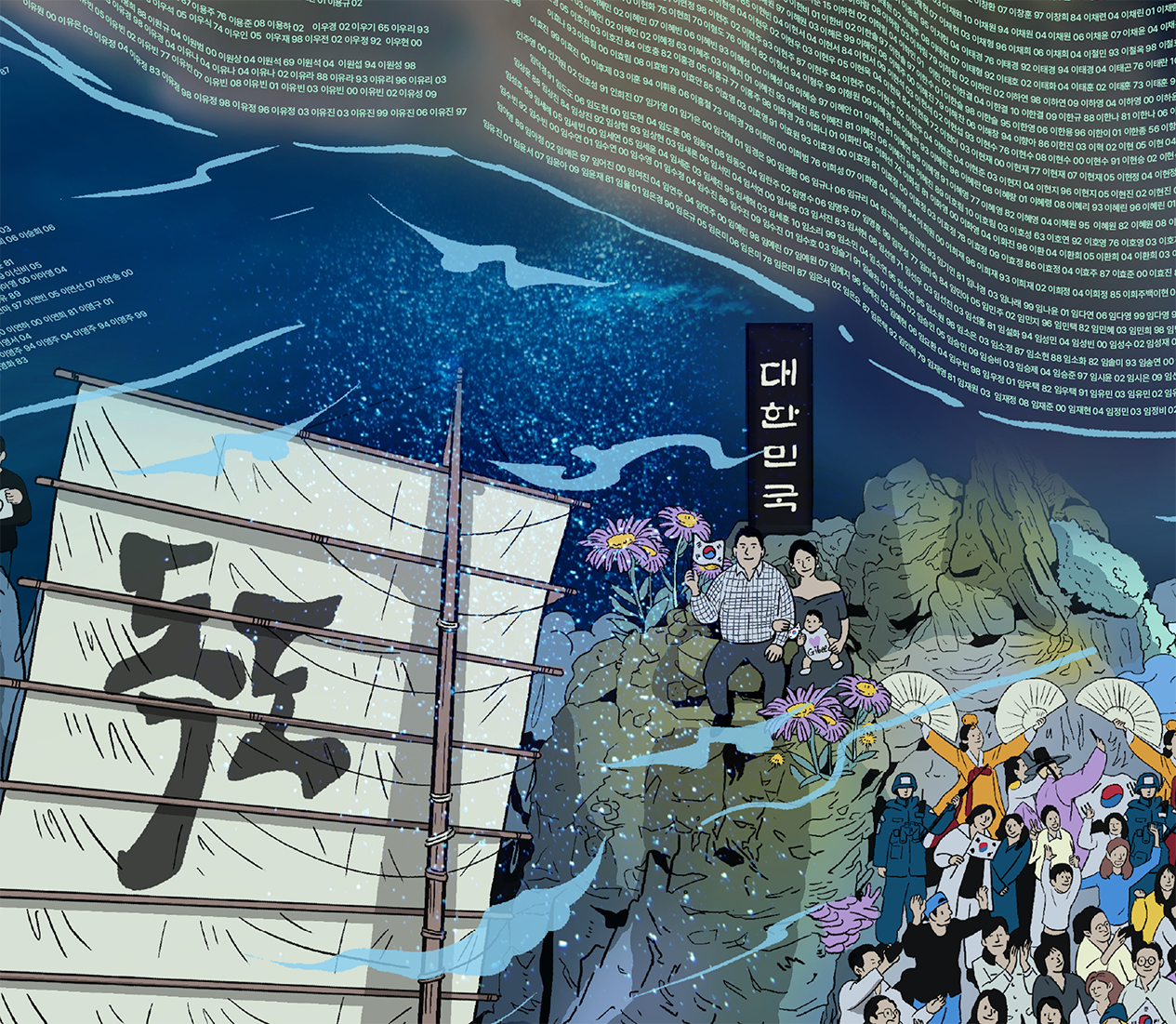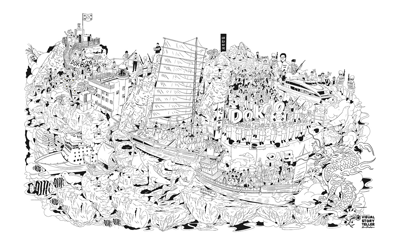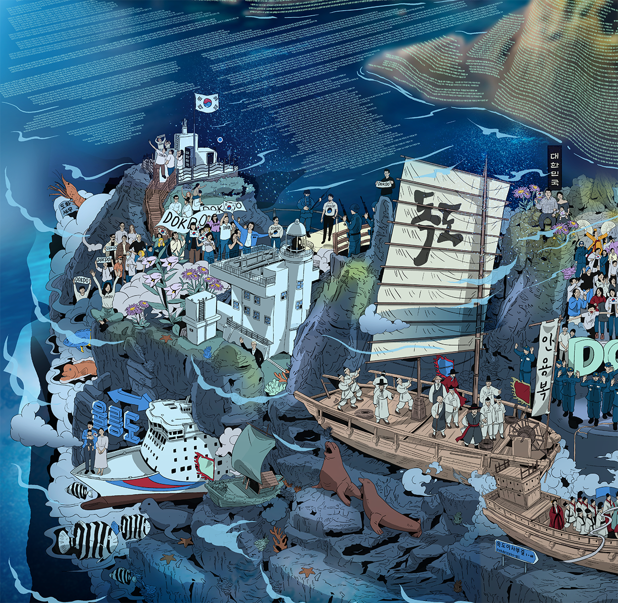 독도를 지키는 우리나라 사람들로 가득한 독도를 표현한 아트워크