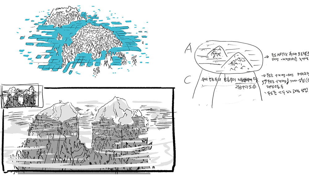 기본적으로 독도의 형태는 유지하면서 14,073 명의 서명자들 이름을 넣은 아트워크 제작